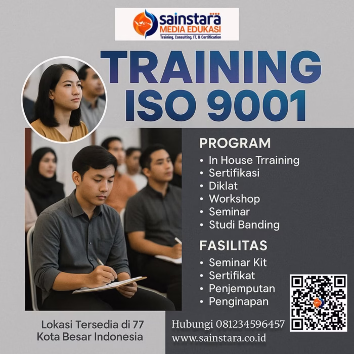 1. Apakah pelatihan ini menjamin saya mendapatkan sertifikasi profesi? Pelatihan ini memberikan Sertifikat Kehadiran/Kompetensi dari SAINSTARA yang menunjukkan penguasaan materi ISO 9001 dan ISO 19011. Untuk Sertifikasi Kompetensi Resmi yang diakui secara nasional (misalnya BNSP), kami memiliki program terpisah (silakan tanyakan detailnya) atau kami dapat membantu mempersiapkan Anda menuju jalur Lead Auditor yang diakui internasional.