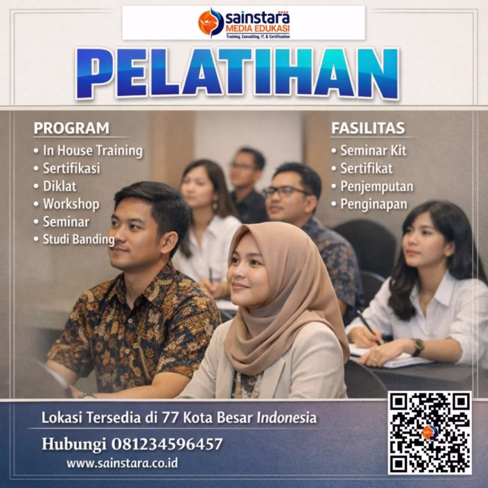 Untuk mendapatkan informasi lebih lengkap mengenai berbagai pilihan pelatihan/training lainnya yang kami selenggarakan, silakan kunjungi website resmi Sainstara. Melalui website tersebut, Anda dapat menemukan daftar program pelatihan terbaru, jadwal kegiatan, serta detail materi yang dirancang untuk mendukung peningkatan kompetensi dan profesionalisme Anda.